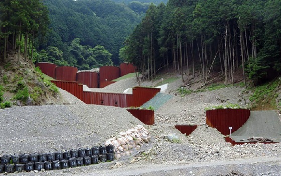壁面は高張力継手強度をもつ直線鋼矢板セグメントの爪の嵌合だけで組立てられ、ボルトレスで1枚板のようになっているため、土石流の衝撃力に強い構造です。