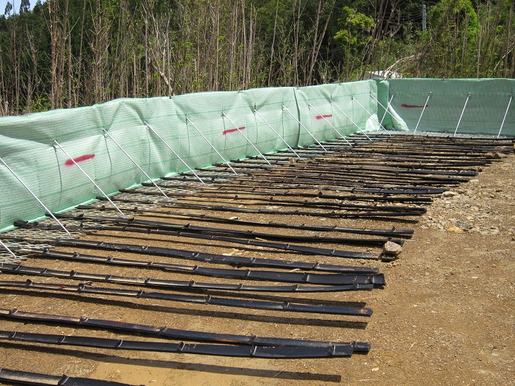 KKー190027ーA 盛土材に敷設する引張り補強材に竹を使用した仮設用の補強土壁工法。 補強材に自然素材である竹を使用する事で、地球環境への負荷を抑制することができ、放置竹林の整備促進も図ることができる。 |